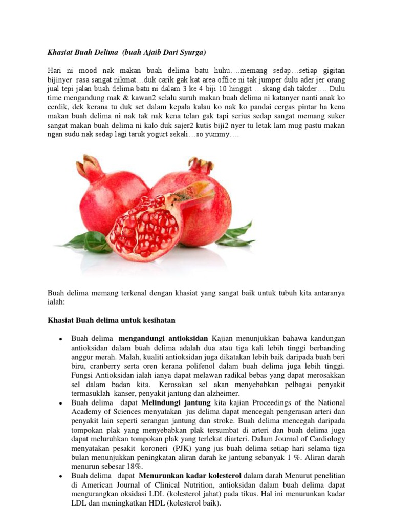 Asam punisat adalah salah satu komponen dalam delima yang membantu menurunkan kolesterol trigliserida dan mengurangi tekanan darah. Potong tipis-tipis kulit buah delima 15 gr serta buah pala myristica fragrans 10 gr lantas rebus dengan gelas air tersisa satu gelas. Mari kita jaga kesehatan dengan mengkonsumsi buah-buahan salah satunya delima.